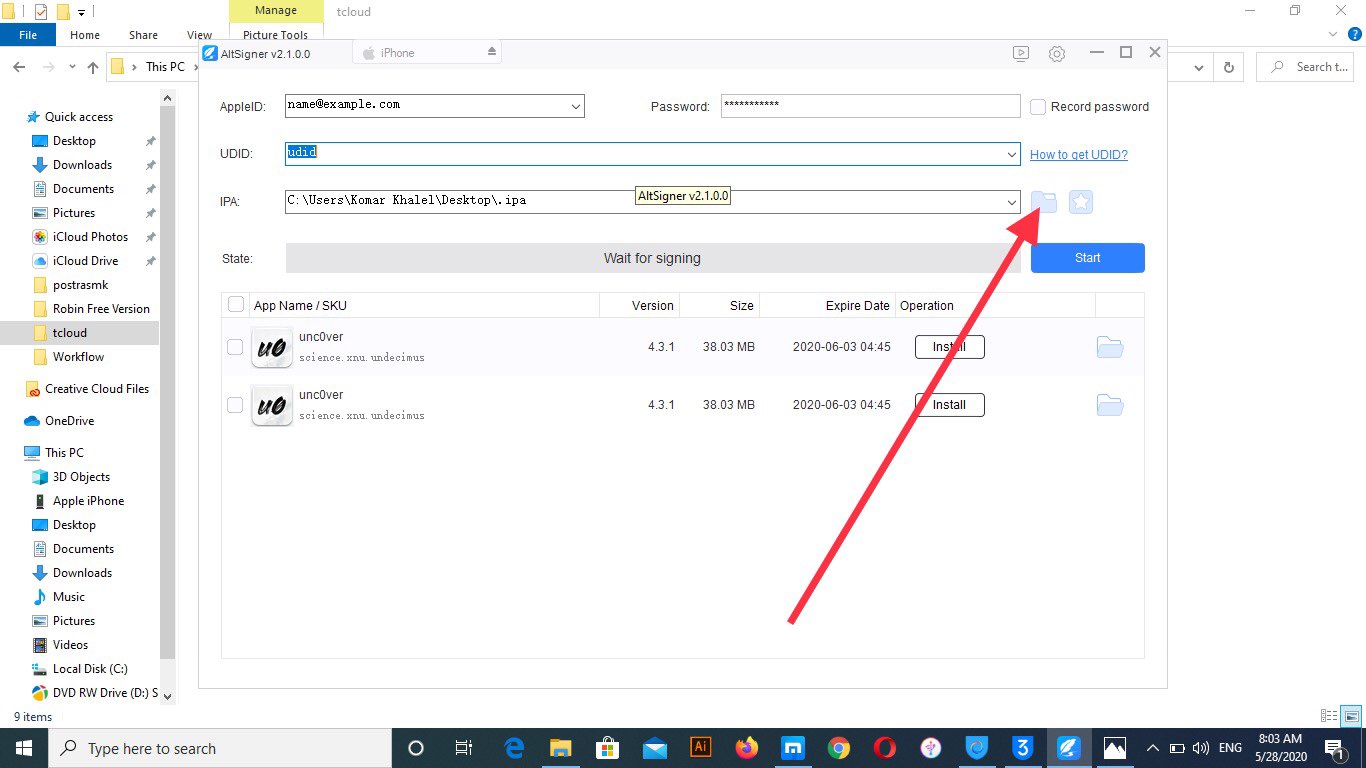 #ئێستا ئەو بەرنامە ھەڵبژێرە كە Altsigner چالاكی كرد! بۆ دۆزینەوەی ئەو بەرنامەی كە Altsigner چالاكی كرد بڕۆ سەر Desktop ئینجا SignedIPA دواتر بەرنامەكە ھەڵبژێرەو open بكە، ئینجا چاوەڕێبە بەرنامەكە دا ئەبەزێت لە موبایلەكەت.